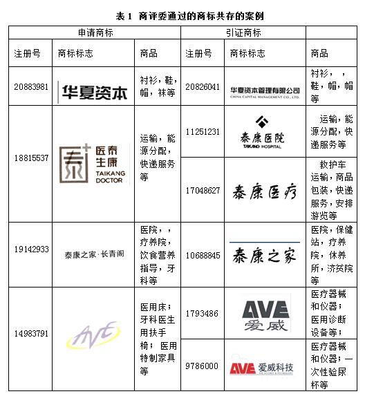 表1 商评委通过的商标共存的案例