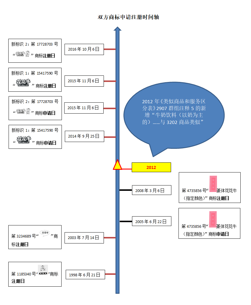 2012年《类似商品和服务区分表》2907群组注释5的新增,直接导致之前不类似的“牛奶饮料(以奶为主)”和3202群组饮料商品构成类似。河南郑牛随后遂开始通过引证第4735856号“ 篆体花花牛(指定颜色)”商标挑战花花牛新标识“图片”“图片”在牛奶饮料(以牛奶为主)商品项目上的注册,导致上述两个新标识在“牛奶饮料(以牛奶为主)”商品项目上的无效。同时,河南郑牛还持续以普通花花牛字体在和花花牛乳业公司主营商品项目相同、类似或者高度关联的商品项目上申请注册商标,双方随即陷入持续数年的商标确权僵局。