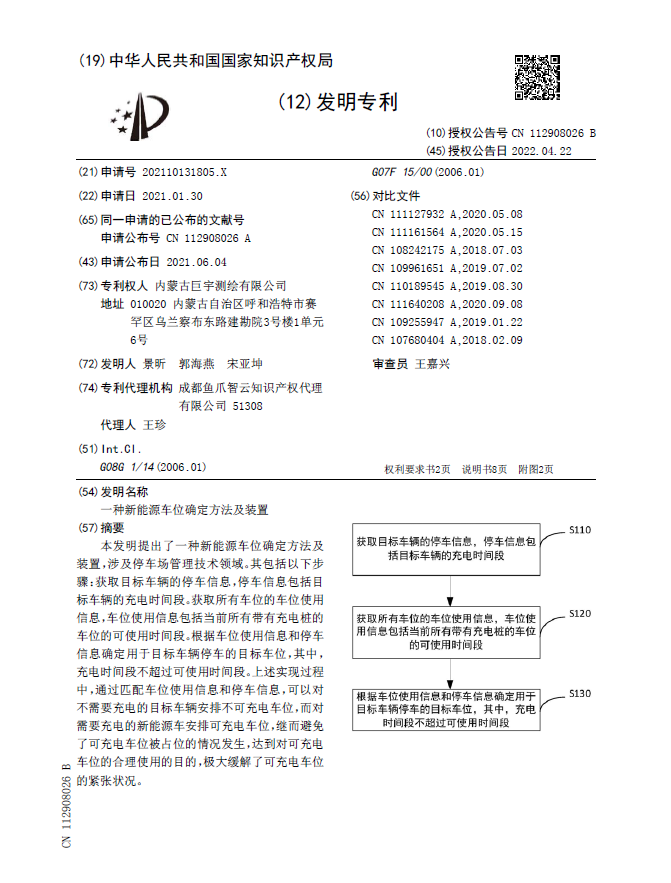 涉案专利“一种新能源车位确定方法及装置”ZL202110131805.X