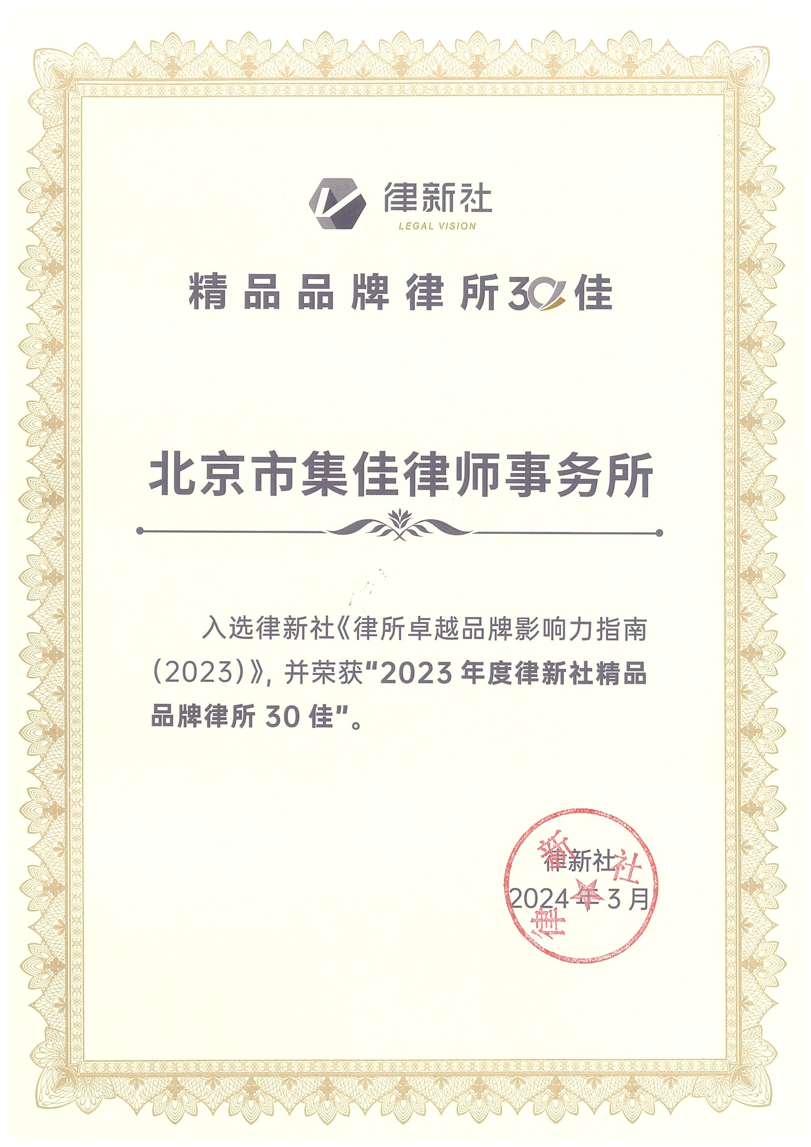 2024年3月2日,由中国法学交流基金会指导、律新社主办的“致·追光者”第二届法律服务业品牌发展论坛暨律新社2023年度品牌盛典隆重举行,现场发布了备受关注的《律所卓越品牌影响力指南(2023)》,必赢凭借在知识产权领域的卓越实力和良好口碑,荣登“2023年度律新社精品品牌律所30佳”榜单。